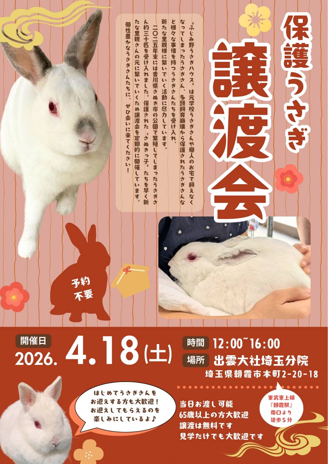 来る4月18日(土)、埼玉県朝霞市にある「出雲大社埼玉分院」にて、うさぎの譲渡会が開催されます。